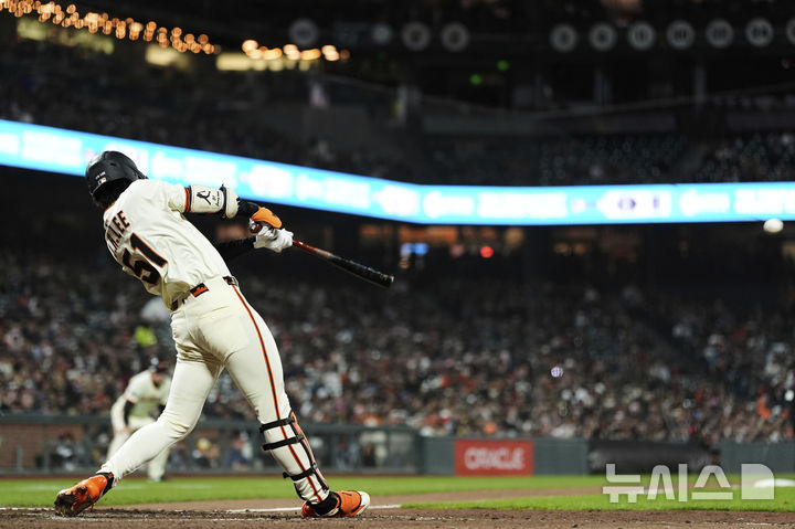[샌프란시스코=AP/뉴시스] 샌프란시스코 자이언츠의 이정후가 21일(현지 시간) 미 캘리포니아주 샌프란시스코의 오라클 파크에서 열린 2025 메이저리그 밀워키 브루어스와의 경기 7회 말 1타점 3루타를 치고 있다. 이정후는 4타수 1안타 1타점을 기록했고 샌프란시스코는 5-2로 역전승을 거뒀다. 2025.04.22.