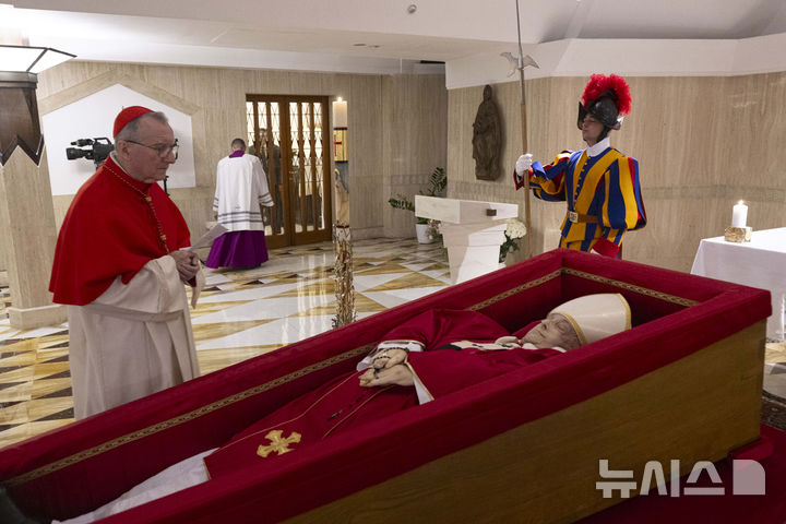 [바티칸=AP/뉴시스] 21일(현지 시간) 바티칸의 교황 개인 경당 내 관 속에 프란치스코 교황의 시신이 안치돼 있다. 교황청은 프란치스코 교황이 로마의 산타 마리아 마조레 대성전 지하에 특별한 장식 없이 간소하게 묻어달라는 유언을 남겼다고 전했다. 2025.04.22.
