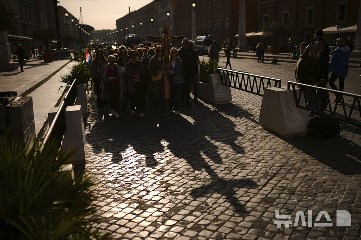 [바티칸=AP/뉴시스] 22일(현지 시간) 크로아티아에서 온 순례자들이 바티칸에 도착하고 있다. 크로아티아는 가톨릭 인구 비중이 매우 높은 나라로, 순례자들은 프란치스코 교황에 대한 존경과 애도의 뜻을 표하기 위해 바티칸에 도착한 것으로 보인다. 2025.04.22.