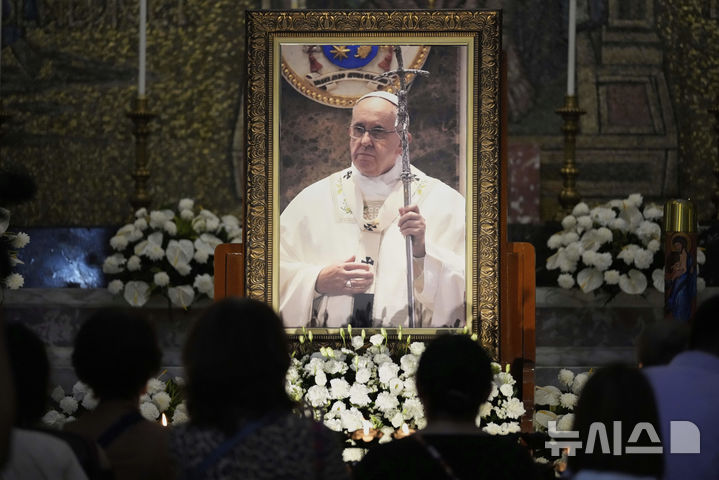 [마닐라=AP/뉴시스] 22일(현지 시간) 필리핀 마닐라의 마닐라 대성당에서 가톨릭 신자들이 고(故) 프란치스코 교황의 초상 앞에 촛불을 밝히고 있다. 필리핀은 전체 인구의 약 80%가 로마 가톨릭 신자로, 세계에서 3번째로 많은 가톨릭 인구를 보유하고 있다. 2025.04.22.