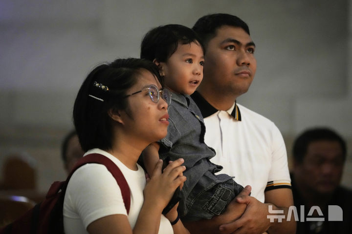 [마닐라=AP/뉴시스] 22일(현지 시간) 필리핀 마닐라의 마닐라 대성당에서 한 가족이 고(故) 프란치스코 교황의 초상을 보면서 기도하고 있다. 필리핀은 전체 인구의 약 80%가 로마 가톨릭 신자로, 세계에서 3번째로 많은 가톨릭 인구를 보유하고 있다. 2025.04.22.