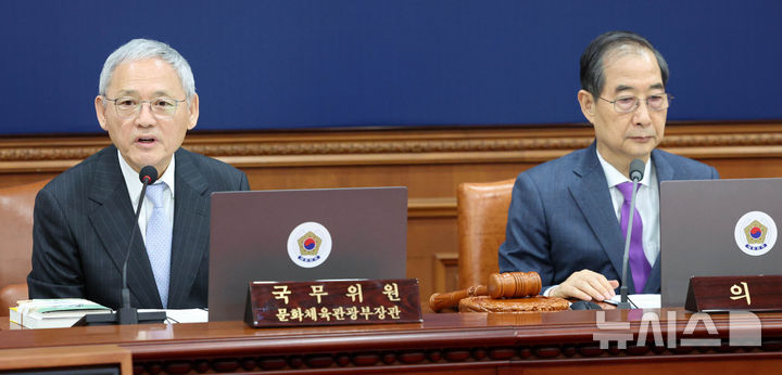 [서울=뉴시스] 고범준 기자 = 유인촌 문화체육관광부 장관이 22일 서울 종로구 정부서울청사에서 열린 국무회의에서 세계 책의 날 관련 발언하고 있다. 2025.04.22. [email protected]