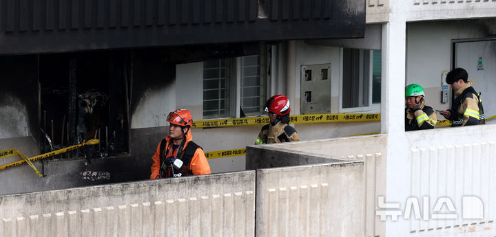 [서울=뉴시스] 추상철 기자 = 22일 오전 방화 사고가 발생한 서울 관악구 봉천동의 한 아파트에서 경찰과 소방, 한국전기안전공사가 합동 현장감식을 하고 있다. 2025.04.22. [email protected]