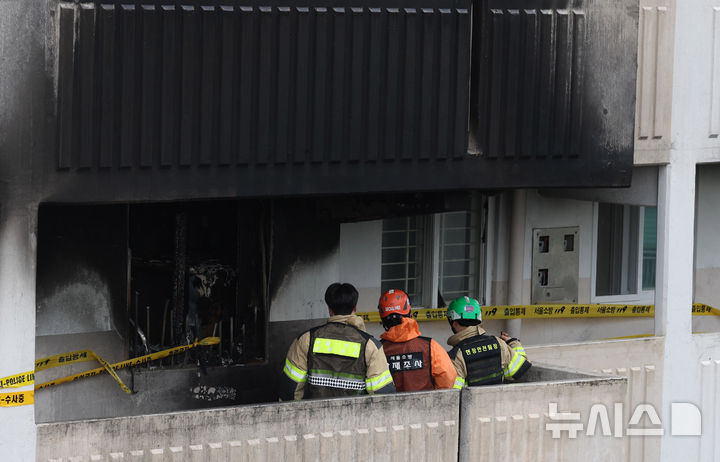 [서울=뉴시스] 추상철 기자 = 22일 오전 방화 사고가 발생한 서울 관악구 봉천동의 한 아파트에서 경찰과 소방, 한국전기안전공사가 합동 현장감식을 하고 있다. 2025.04.22. [email protected]