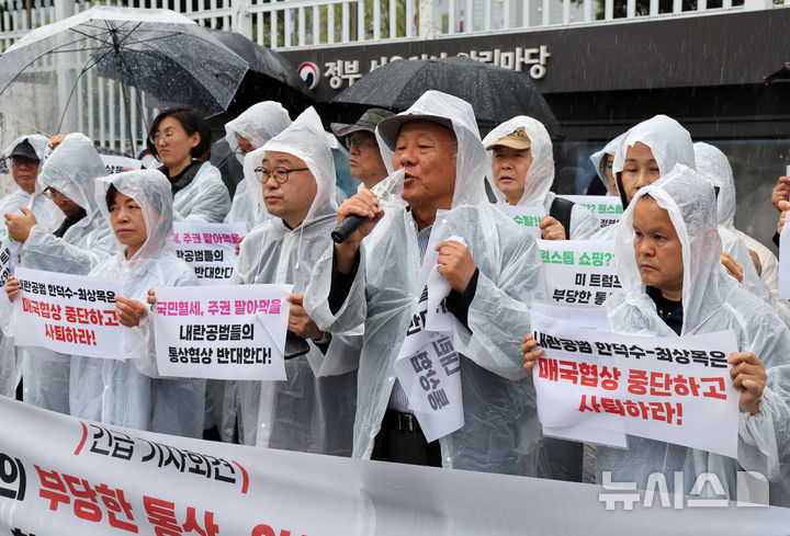 [서울=뉴시스] 배훈식 기자 = 자주통일평화연대 등 시민사회단체 회원들이 22일 오전 서울 종로구 정부서울청사 앞에서 기자회견을 열고 한미 관세 협상 중단과 한덕수 대통령 권한대행 국무총리와 최상목 경제부총리 겸 기획재정부 장관의 사퇴를 촉구하고 있다. 2025.04.22. [email protected]