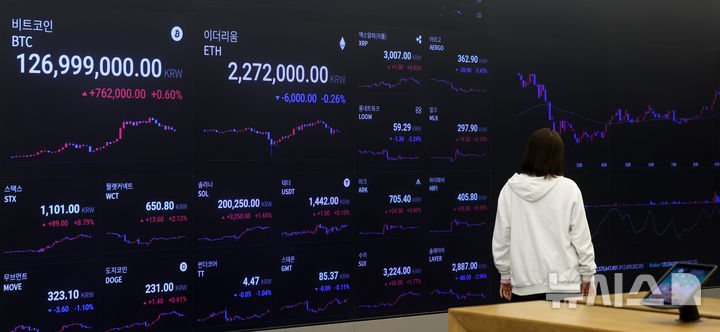 보유금액은 지난해 10월 58조원에서 11월 102조6000억원으로 2배 가까이 불어났으며 12월에도 104조1000억원으로 증가세를 이어갔다. 22일 서울 강남구 소재 가상자산거래소 업비트 고객센터 내 시황판에서 비트코인 등 가산자산 시황이 표시되고 있다. 2025.04.22. [email protected]