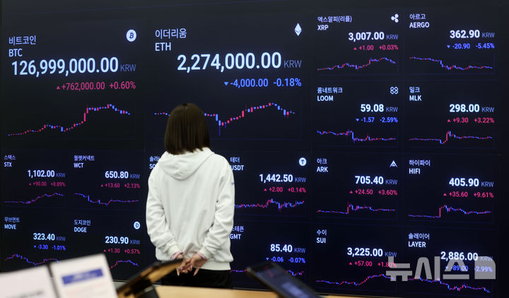 보유금액은 지난해 10월 58조원에서 11월 102조6000억원으로 2배 가까이 불어났으며 12월에도 104조1000억원으로 증가세를 이어갔다. 22일 서울 강남구 소재 가상자산거래소 업비트 고객센터 내 시황판에서 비트코인 등 가산자산 시황이 표시되고 있다. 2025.04.22. [email protected]