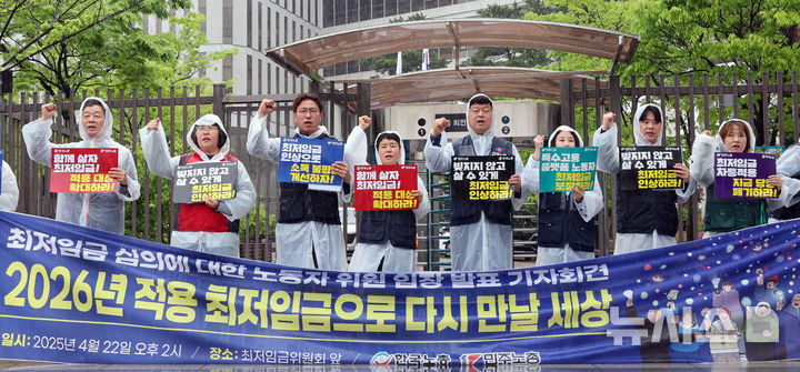 [세종=뉴시스] 강종민 기자 = 2026년 적용 최저임금위원회의 첫 전원회의일인 22일 세종시 어진동 정부세종청사 고용노동부 앞에서 최저임금위 노동자 위원들이 입장 발표 기자회견에 앞서 구호를 외치고 있다. 2025.04.22. [email protected]