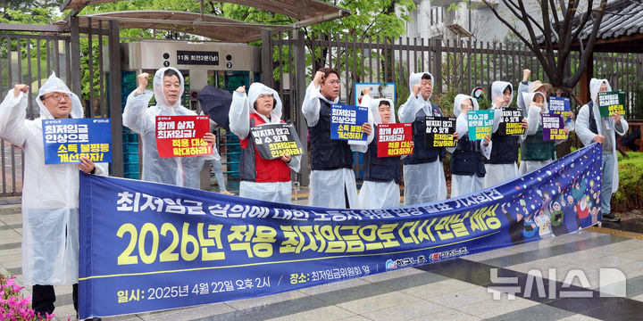 [세종=뉴시스] 강종민 기자 = 2026년 적용 최저임금위원회의 첫 전원회의일인 22일 세종시 어진동 정부세종청사 고용노동부 앞에서 최저임금위 노동자 위원들이 입장 발표 기자회견에 앞서 구호를 외치고 있다. 2025.04.22. [email protected]