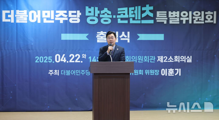 [서울=뉴시스] 권창회 기자 = 박찬대 더불어민주당 당대표 직무대행 겸 원내대표가 22일 오후 서울 여의도 국회 의원회관에서 열린 더불어민주당 방송콘텐츠특별위원회 출범식에서 인사말을 하고 있다. 2025.04.22. [email protected]