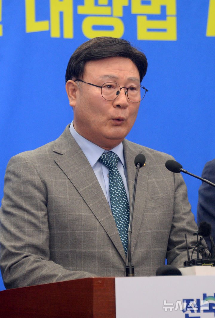 [전주=뉴시스] 김얼 기자 = 문승우 전북특별자치도의회 의장이 22일 전북 전주시 전북특별자치도청 기자회견장에서 열린 대광법 개정 공포 관련 브리핑에 참석해 기자들의 질의에 답변하고 있다. 2025.04.22. [email protected]