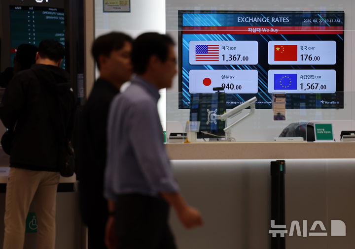 [인천공항=뉴시스] 이영환 기자 = 22일 인천국제공항 제2여객터미널 은행 환전소에 달러 팔때 가격이 표시되고 있다.