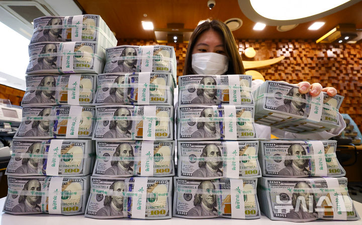 [서울=뉴시스] 황준선 기자 = 22일 서울 중구 하나은행 위변조대응센터에서 직원이 달러화를 정리하고 있다.