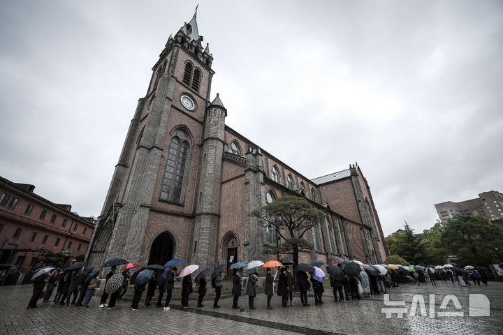 [서울=뉴시스] 정병혁 기자 = 제266대 교황인 프란치스코 교황이 선종한 가운데 22일 서울 중구 명동대성당을 찾은 시민들이 빈소에 조문하기 위해 줄 서 있다. 2025.04.22. [email protected]
