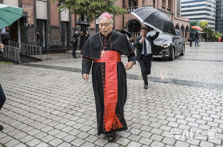 [서울=뉴시스] 정병혁 기자 = 염수정 추기경이 22일 서울 중구 명동대성당에 마련된 프란치스코 교황 빈소에 조문하기 위해 지하성당으로 들어가고 있다. 2025.04.22. [email protected]