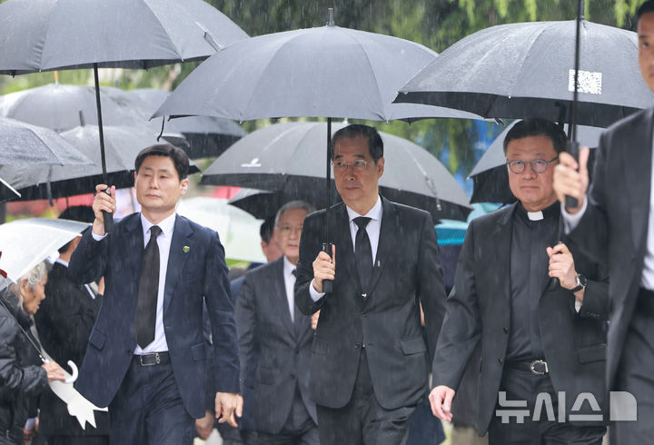 [서울=뉴시스] 최진석 기자 = 한덕수 대통령 권한대행 국무총리가 22일 서울 명동대성당 지하성당에 마련된 프란치스코 교황 빈소 조문을 마친 후 이동하고 있다. (대통령실통신사진기자단) 2025.04.22. [email protected]