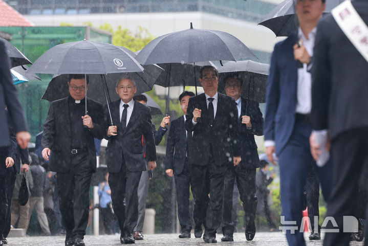[서울=뉴시스] 최진석 기자 = 한덕수 대통령 권한대행 국무총리가 22일 서울 명동대성당 지하성당에 마련된 프란치스코 교황 빈소 조문을 위해 이동하고 있다. (대통령실통신사진기자단) 2025.04.22. [email protected]