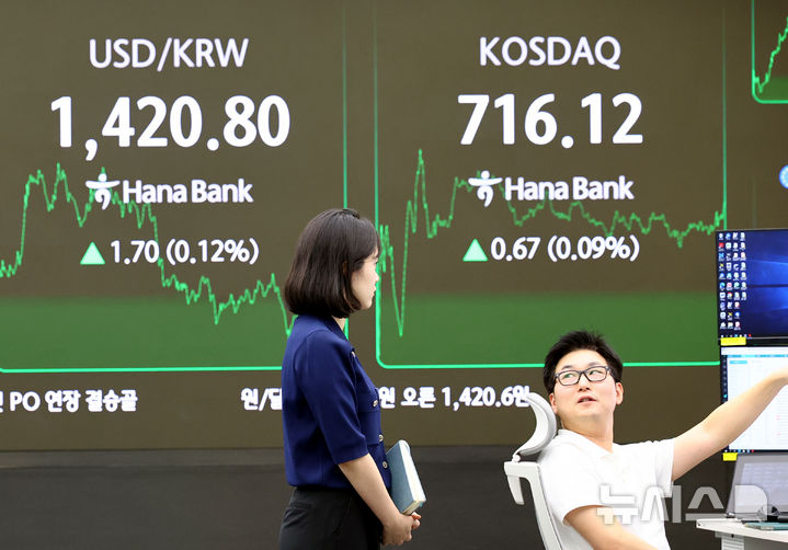 이날 코스닥 지수는 전 거래일(715.45)보다 0.67포인트(0.09%) 오른 716.12에 거래를 종료했고 서울 외환시장에서 원·달러 환율은 전 거래일 주간거래 종가(1419.1원)보다 1.5원 오른 1420.6원에 주간 거래를 마감했다. 2025.04.22. [email protected]