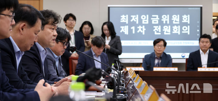 [세종=뉴시스] 강종민 기자 = 22일 세종시 정부세종청사에서 열린 최저임금위원회 제1차 전원회의에서 이인재 위원장이 모두발언을 하고 있다. 2025.04.22. [email protected]