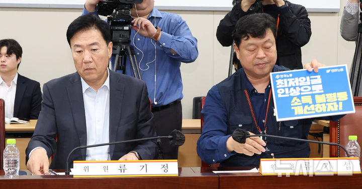 [세종=뉴시스] 강종민 기자 = 22일 세종시 정부세종청사에서 열린 최저임금위원회 제1차 전원회의에서 류기섭 근로자 위원이 최저임금 인상 피켓을 책상에 올리고 있다. 왼쪽은 류기정 사용자 위원. 2025.04.22. [email protected]