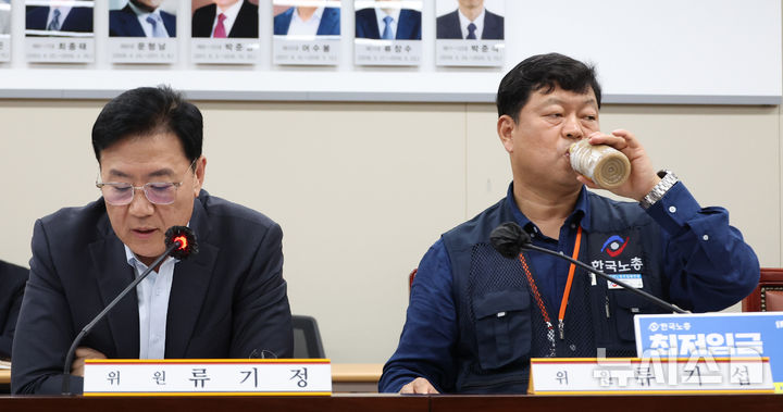 [세종=뉴시스] 강종민 기자 = 22일 세종시 정부세종청사에서 열린 최저임금위원회 제1차 전원회의에서 류기정 사용자 위원의 발언을 듣던 류기섭 근로자 위원이 음료를 마시고 있다. 2025.04.22. [email protected]