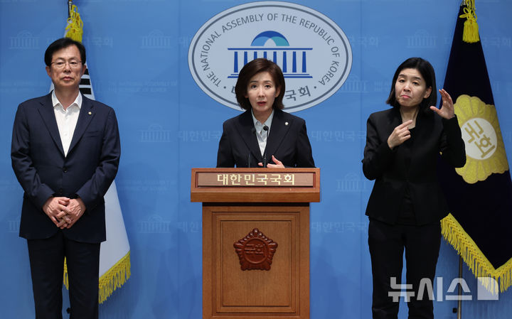 [서울=뉴시스] 조성우 기자 = 나경원(가운데) 제21대 대통령 선거 국민의힘 경선 후보가 22일 오후 서울 여의도 국회 소통관에서  부산, 울산, 경남 지역 관련 공약을 발표하고 있다. 왼쪽은 캠프 정책총괄본부장인 이만희 의원. 2025.04.22. [email protected]