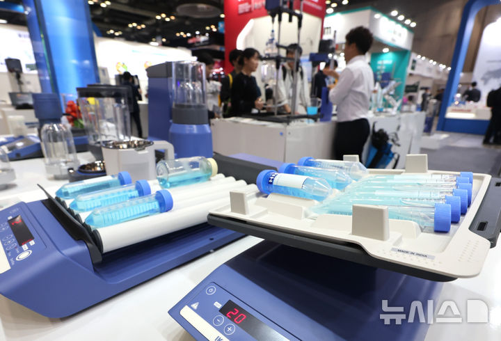 [고양=뉴시스] 전진환 기자 = 22일 경기도 고양시 킨텍스에서 열린  '국제 제약·화장품 위크 2025'(ICPI WEEK 2025)에서 관람객들이 쉐이커 등 실험 장비에 대한 설명을 듣고 있다.