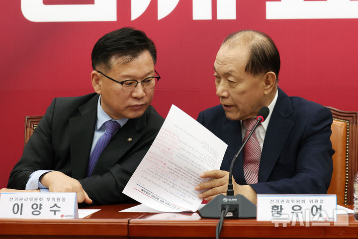 [서울=뉴시스] 조성우 기자 = 황우여(오른쪽) 국민의힘 선거관리위원장이 22일 오후 서울 여의도 국회에서 제21대 대통령 선거 후보자 선출 2차 경선 진출자 명단 발표에 앞서 이양수 부위원장과 대화하고 있다. 2차 경선을 진출한 후보자는 김문수, 안철수, 한동훈, 홍준표 등 4명이다. 2025.04.22. [email protected]