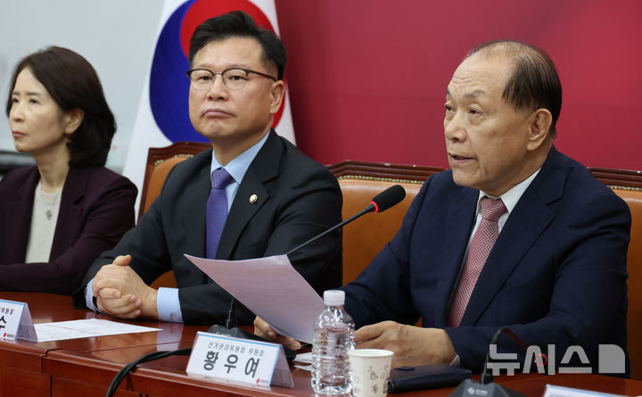 [서울=뉴시스] 조성우 기자 = 황우여(오른쪽) 국민의힘 선거관리위원장이 22일 오후 서울 여의도 국회에서 제21대 대통령 선거 후보자 선출 2차 경선 진출자 명단을 발표하고 있다. 2차 경선을 진출한 후보자는 김문수, 안철수, 한동훈, 홍준표 등 4명이다. 2025.04.22. [email protected]