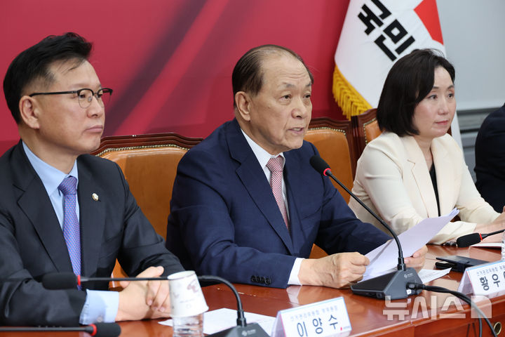 [서울=뉴시스] 조성우 기자 = 황우여(가운데) 국민의힘 선거관리위원장이 22일 오후 서울 여의도 국회에서 제21대 대통령 선거 후보자 선출 2차 경선 진출자 명단을 발표하고 있다. 2차 경선을 진출한 후보자는 김문수, 안철수, 한동훈, 홍준표 등 4명이다. 2025.04.22. [email protected]