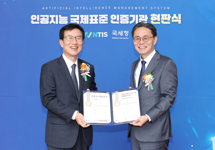 [서울=뉴시스] 홍효식 기자 = 국세청은 이달 초 인공지능(AI) 국제표준(ISO/IEC 42001) 인증을 획득했다고 22일 밝혔다. 문동민 한국표준협회장이 강민수 국세청장(오른쪽)에게 'ISO/IEC 42001 인증서'를 수여하고 있다. (사진=국세청 제공) 2025.04.22. [email protected] *재판매 및 DB 금지