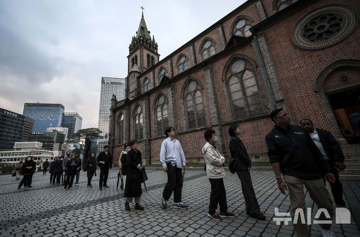 [서울=뉴시스] 정병혁 기자 = 제266대 교황인 프란치스코 교황이 선종한 가운데 22일 서울 중구 명동대성당을 찾은 시민들이 빈소에 조문하기 위해 줄 서 있다. 2025.04.22. [email protected]