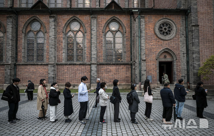 [서울=뉴시스] 정병혁 기자 = 제266대 교황인 프란치스코 교황이 선종한 가운데 22일 서울 중구 명동대성당을 찾은 시민들이 빈소에 조문하기 위해 줄 서 있다. 2025.04.22. [email protected]