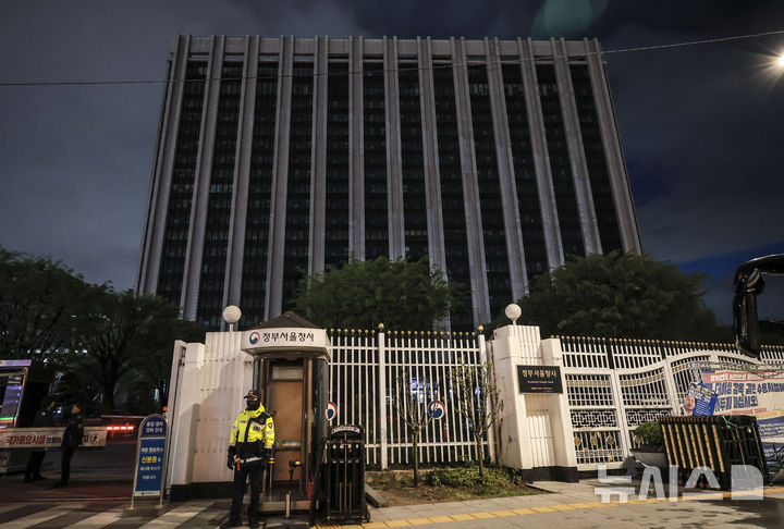 [서울=뉴시스] 정병혁 기자 = 지구의날인 22일 서울 종로구 정부서울청사의 불이 꺼져있다. 올해로 55주년을 맞은 지구의날은 오후 8시부터 10분간 서울과 과천, 세종의 정부청사와 부산 광안대교, 송도 센트럴파크, 수원 화성행궁 등 전국 곳곳 주요 랜드마크에서 지구의 소중함을 알리기 위한 동시 소등 행사가 진행됐다. 2025.04.22. [email protected]