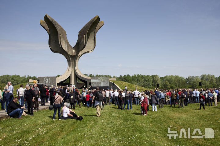 [야세노바츠=AP/뉴시스] 22일(현지 시간) 크로아티아 시사크모슬라비나주 야세노바츠 추모 공원에 제2차 세계대전 희생자들을 추모하는 사람들이 모여 있다. 야세노바츠는 2차대전 당시 나치 괴뢰 정권인 크로아티아 파시즘 조직 '우스타샤'가 운영한 강제 수용소로, 당시 7만~8만 명이 희생된 것으로 전해진다. 2025.04.23.