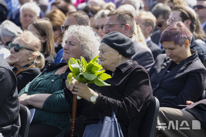 [야세노바츠=AP/뉴시스] 22일(현지 시간) 크로아티아 시사크모슬라비나주 야세노바츠 추모 공원에서 사람들이 제2차 세계대전 희생자들을 추모하고 있다. 야세노바츠는 2차대전 당시 나치 괴뢰 정권인 크로아티아 파시즘 조직 '우스타샤'가 운영한 강제 수용소로, 당시 7만~8만 명이 희생된 것으로 전해진다. 2025.04.23.