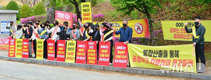 [청주=뉴시스] 서주영 기자 = 충북예술고등학교 미술과 학부모들이 23일 청주시 흥덕구 충북예술고 앞에서 학교의 성적 산출 방식 변동을 규탄하는 피켓시위를 하고 있다. 2025.04.23. [email protected]