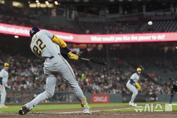 [샌프란시스코=AP/뉴시스] 밀워키 브루어스의 크리스티안 옐리치가 22일(현지 시간) 미 캘리포니아주 샌프란시스코의 오라클 파크에서 열린 2025 메이저리그 샌프란시스코 자이언츠와의 경기 6회 초 만루 홈런을 치고 있다. 2025.04.23.