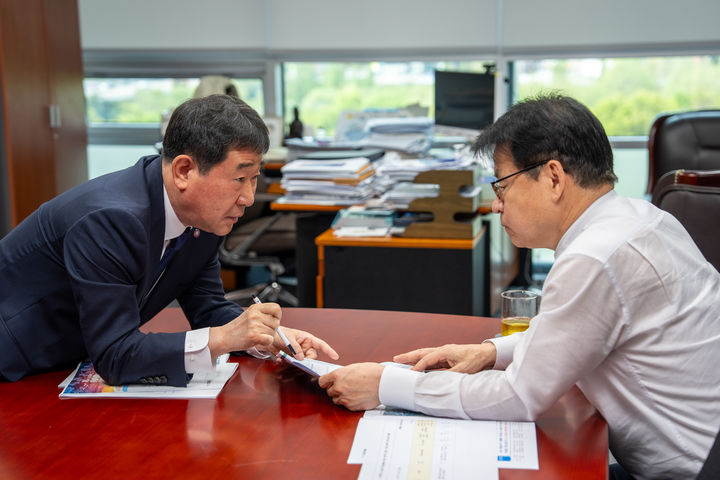 [증평=뉴시스] 23일 국회를 방문한 이재영(왼쪽) 충북 증평군수가 지역구 임호선 국회의원을 만나 국비 지원을 요청하고 있다. (사진=증평군 제공) 2025.4.23. [email protected]