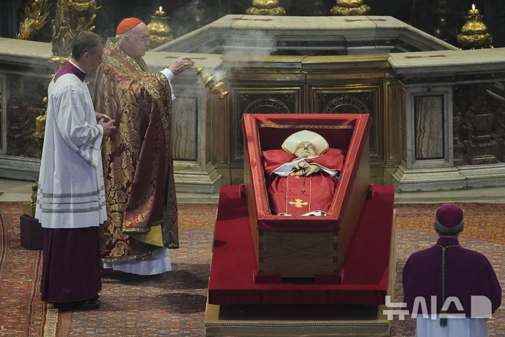 [바티칸시국=AP/뉴시스] 23일(현지 시간) 바티칸의 성 베드로 대성당에서 궁무처장 케빈 조셉 패럴 추기경이 프란치스코 교황의 시신 주위에 향을 뿌리고 있다. 프란치스코 교황의 시신은 사흘간 대성당에 안치돼 일반 신자들의 조문을 받는다. 2025.04.23.