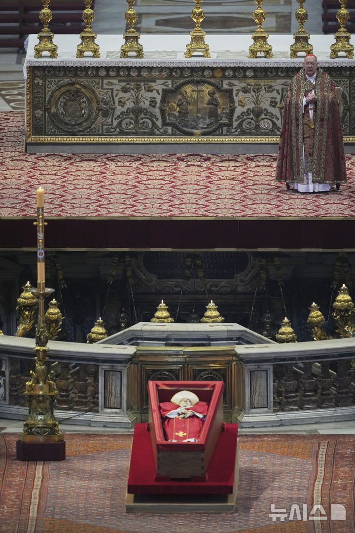 [바티칸시국=AP/뉴시스] 23일(현지 시간) 바티칸의 성 베드로 대성당에 프란치스코 교황의 시신이 안치돼 있다. 프란치스코 교황의 시신은 사흘간 이곳에 안치돼 일반 신자들의 조문을 받는다. 2025.04.23.