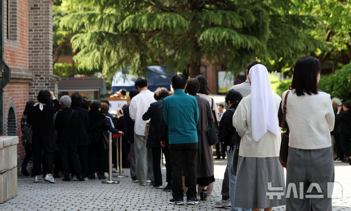 [서울=뉴시스] 김선웅 기자 = 23일 서울 중구 명동대성당 지하성당에 마련된 故 프란치스코 교황 분향소에서 신자들이 조문을 하기 위해 줄을 서고 있다. 2025.04.23. [email protected]
