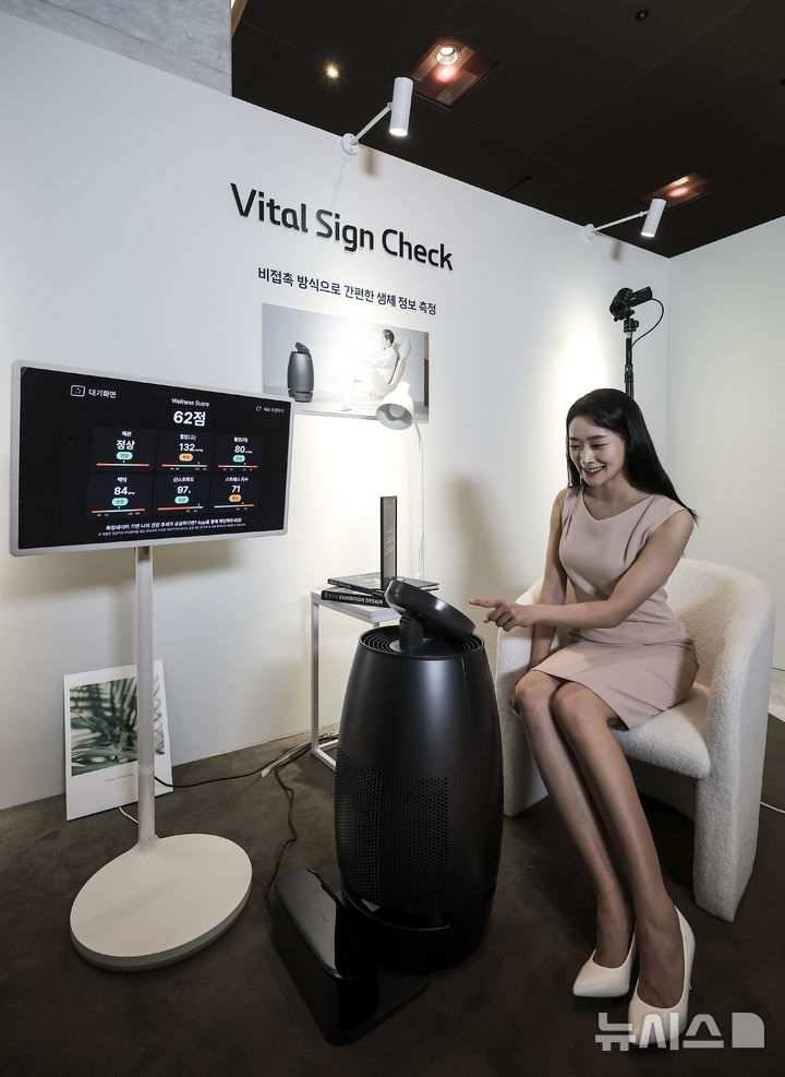 [서울=뉴시스] 정병혁 기자 = 23일 서울 광진구 그랜드워커힐서울에서 열린 웰니스 라이프 브랜드 '나무엑스' 런칭 쇼케이스에서 모델이 신제품 웰니스 로봇 '나무엑스'를 통한 비접촉 바이탈 사인 체크를 시연하고 있다. 2025.04.23. [email protected]