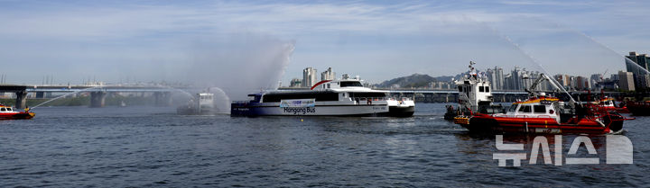 [서울=뉴시스] 김명년 기자 = 23일 오전 서울 영등포구 마포대교 인근에서 열린 한강버스 수난사고 대비 민관합동 현장 대응훈련에서 소방이 화재를 진압하고 있다.(공동취재) 2025.04.23. [email protected]