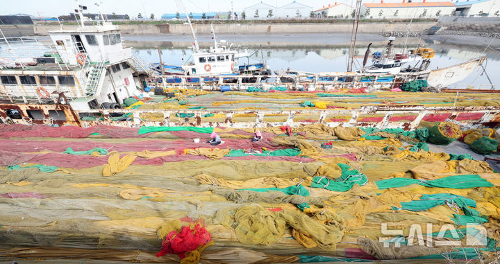 [인천=뉴시스] 전진환 기자 =  완연한 봄 날씨를 보인 23일 인천 중구 북성포구에서 어민들이 출어를 위해 그물을 손질하고 있다.  2025.04.23. [email protected]
