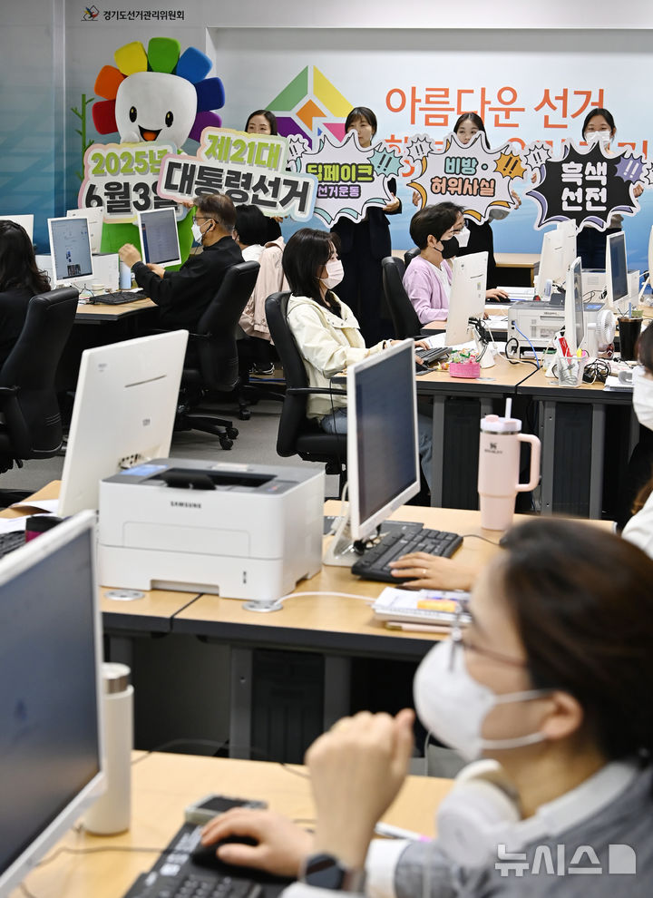 [수원=뉴시스] 김종택 기자 = 제21대 대통령선거를 41일 앞둔 23일 경기 수원시 영통구 경기도선거관리위원회에서 사이버공정선거지원단 관계자들이 허위사실 공표·비방, 딥페이크 선거운동 등 사이버 선거 범죄 행위를 모니터링 하고 있다. 2025.04.23. [email protected]