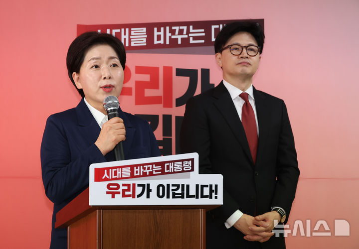[서울=뉴시스] 조성봉 기자 = 국민의힘 대선 1차 경선에서 컷오프된 양향자(왼쪽) 후보가 23일 오후 서울 여의도 캠프 사무실에서 한동훈 제21대 대통령 선거 국민의힘 경선 후보 지지를 선언하고 있다. [email protected]