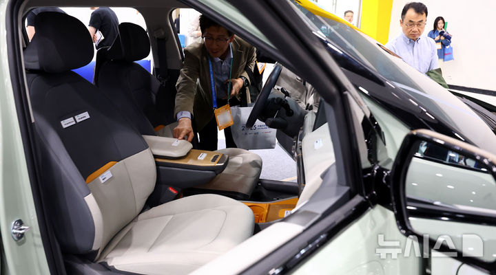 [서울=뉴시스] 박주성 기자 = 23일 서울 서초구 aT센터에서 열린 2025 자동차부품산업 ESG·탄소중립 박람회에서 관람객들이 버려지는 자원과 천연재료로 내·외장 부품을 설계한 자동차를 관람하고 있다. 2025.04.23. [email protected]