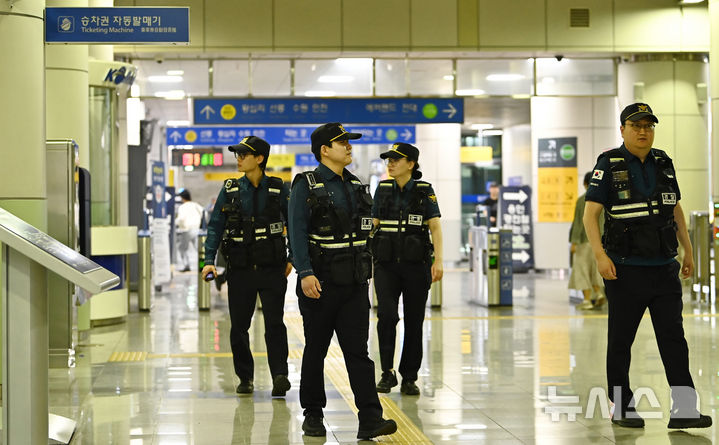 [용인=뉴시스] 김종택 기자 = 수도권 전철 수인분당선 기흥역에 폭탄을 설치했다는 내용의 온라인 게시글이 올라와 경찰이 작성자 추적에 나선 23일 경기 용인시 기흥역 일대에서 경찰이 수색 등 경계활동을 강화하고 있다. 2025.04.23. [email protected]