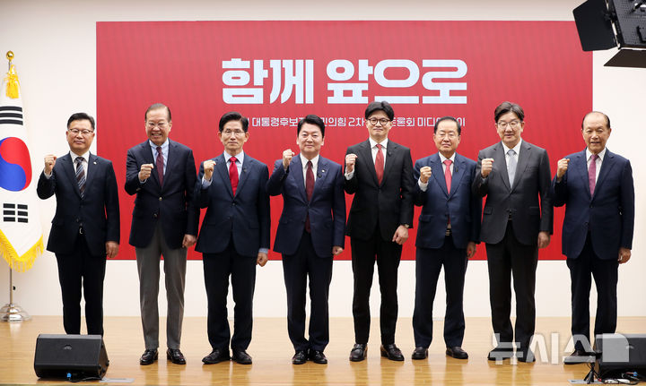 [서울=뉴시스] 국회사진기자단 = 김문수(왼쪽 세번째부터), 안철수, 한동훈, 홍준표 제21대 대통령 선거 국민의힘 경선 후보가 23일 서울 여의도 국민의힘 중앙당사에서 열린 2차 경선토론회 미디어데이에서 당 지도부와 기념촬영을 하고 있다. 2025.04.23. [email protected]